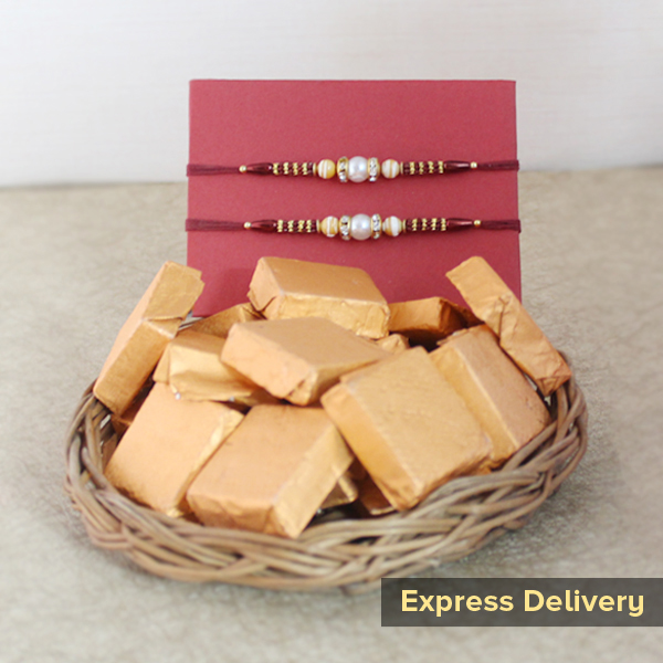 It Contains • 2 Rakhis • 250 gm of Assorted Chocolates • Roli and chawal This one is to make your dear brother feel happy like never before! It’s a combo of two Rakhis and chocolates and we will send your gift with our express services, making it sure that it reaches to your brother’s door step on time. So, don’t wait to place your order….Because you don’t have time!