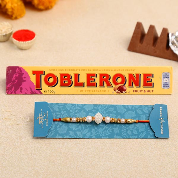 Product Details: One American Diamond Flower Rakhi, This designer rakhi exhibits American diamond flower, Toblerone Chocolate Milk Bar, Weight- 100 gms, Complimentary Roli Chawal packed in a small card, Beautifully packed in Sneh Box
