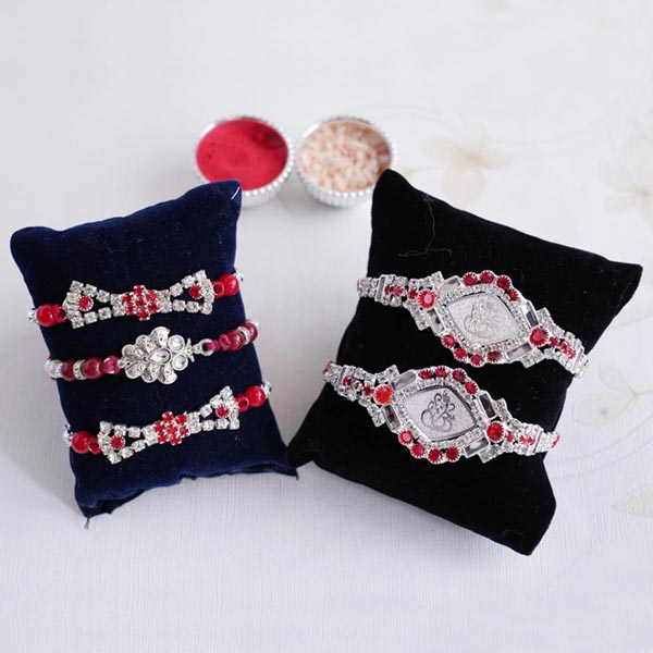 Product Overview: • Rakhi Type: Five silver Rakhis • Set Type: Set of 5 Rakhis • Recipient: Brothers • Color: Multicolored • Material Used: Stones, beads, silver-plated metal, and silk thread • Pack of Roli & Chawal and containers are free with Rakhi set