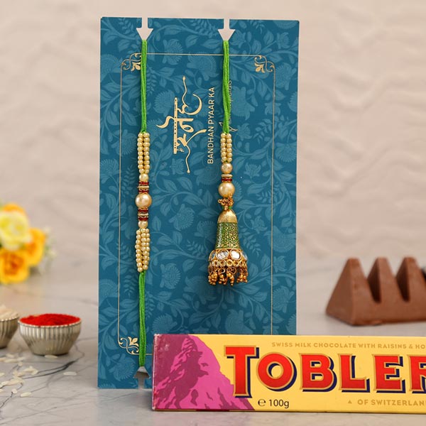 Product Details One Bhaiya Bhabhi Lumba Rakhi Set, Ethnic Rakhi Design, Toblerone Chocolate Milk Bar, Weight- 100 gms, Complimentary Roli Chawal packed in a small card, Beautifully packed in Sneh Box