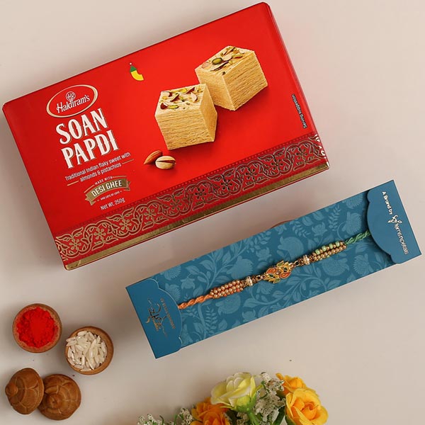 Product Details: One Designer Pearl Rakhi, This designer rakhi showcases pearl detailing for an ethnic look, Complimentary Roli Chawal packed in a small card, This Rakhi is packed in a beautiful Sneh envelope