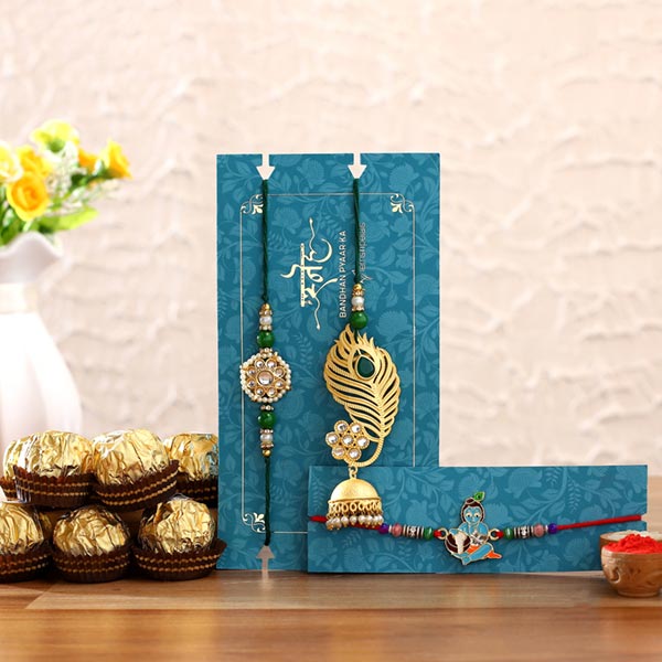Product Details One Bhaiya Bhabhi Lumba Rakhi Set, This jhumki style rakhi set displays peacock feather for an Indian look, One Bal Krishna Rakhi, This Rakhi is categorically designed for kids who are fond of devotional cartoon characters, Ferre