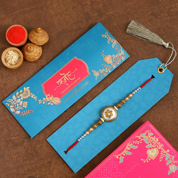 Product Details: One Designer Pearl Rakhi, This designer rakhi showcases pearl detailing for an ethnic look, Almonds- 250 gms, Complimentary Roli Chawal packed in a small card, Beautifully packed in Sneh Box,