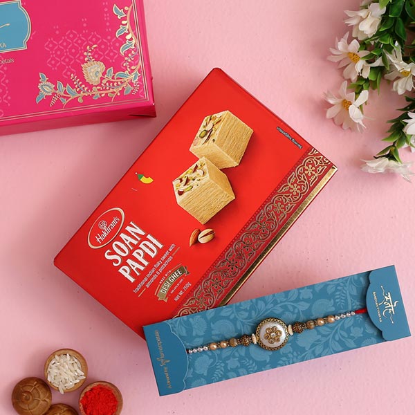 Product Details: One Bhaiya Bhabhi Lumba Rakhi Set, Perfectly designed with blue pearls, This Lumba Rakhi set highlights feather style detailing, Complimentary Roli Chawal packed in a small card, This Rakhi Set is packed in a beautiful Sneh envelope,