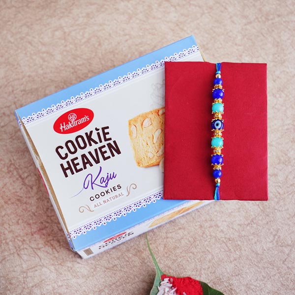 Rakhi Details: • Rakhi Type: Evil Eye Rakhi • Set Type: Single Rakhi • Recipient: Brothers • Color: Multicolored • Material Used: Evil eye stones, beads, and silk threads • A packet of Roli and Chawal with containers Cookies • A pack of Haldiram Kaju cookies of 200 gm