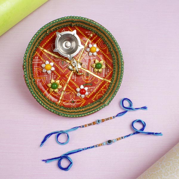 Fancy Two Rakhi set with Puja Thali Hamper - For Europe