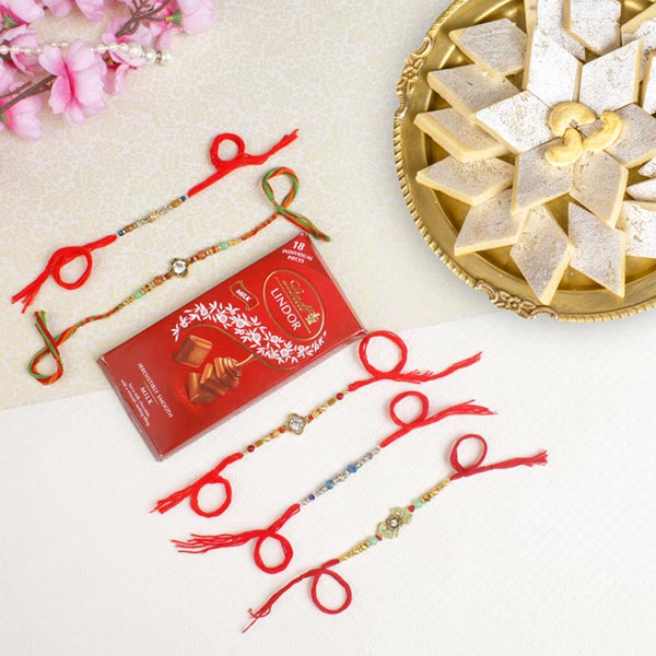 Fascinating Five Set of Rakhis with Kaju Katli & Lindt Chocolate For UK