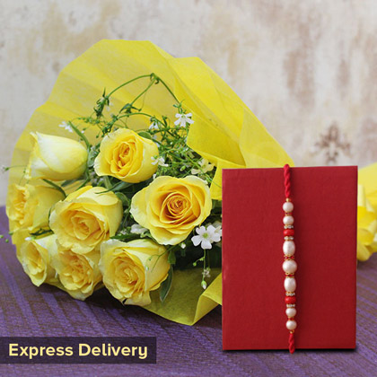 It Contains: • 1 Bunch of beautiful 8 yellow roses • 1 Eye-Catchy Rakhi • Roli and chawal for teeka If you share a very friendly relationship with your dearest brother then this is the time to make him feel loved as Raksha Bandhan is here. All that you need is to hurry and place order for this wonderful Rose bunch and Rakhi combo as this is the last opportunity to convey love to brother with a gift.