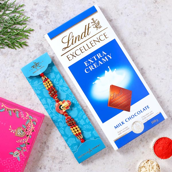 Product Details One Red Ganesha & Rudraksha Rakhi, This devotional rakhi highlights red Ganesha & rudraksha for a pure look, Lindt Excellence Extra Creamy Bar- 100 gms, Complimentary Roli Chawal packed in a small card, Beautifully packed in Sneh