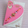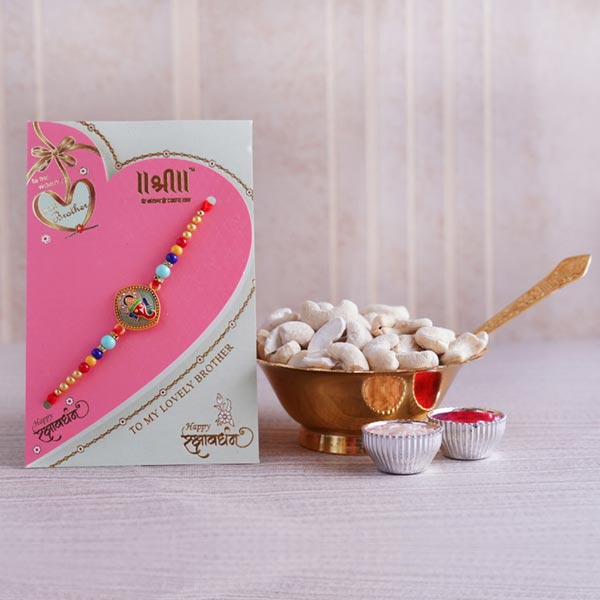 Product Details: • Rakhi Type: Designer Ganesha Rakhi on a Card • Set Type: Single Rakhi • Recipient: Brothers • Color: Multicolored • Material Used: Gold-plated metal, stones, beads, and silk threads • A packet of Roli and Chawal with containers Dry fruits • 100 gm Cashews Other Gifts • One golden bowl with a spoon in a box
