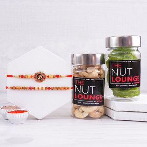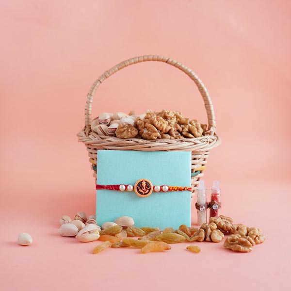 Product Details: • Rakhi Type: Golden Ganesha Rakhi • Set Type: Single Rakhi • Recipient: Brothers • Color: Multicolored • Material Used: Gold-plated metal, stones, beads, and silk threads • A packet of Roli and Chawal with containers Dry fruits • 100 gm Almonds • 100gm Cashews • 100gm Pistachios • 100gm Walnuts Other Gifts • A wooden basket