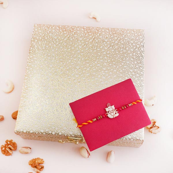 Product Details: • Rakhi Type: Golden Ganesha Rakhi • Set Type: Single • Recipient: Brother • Color: Multicolored • Brand: Sendrakhi.com • A packet of Roli and Chawal is included with containers Dryfruits • 100gm of Cashew • 100gm of Almonds • 100gm of Walnuts • 100gm of Pistachios Other Gifts • Dryfruits are packed in a golden designer dry fruit box.