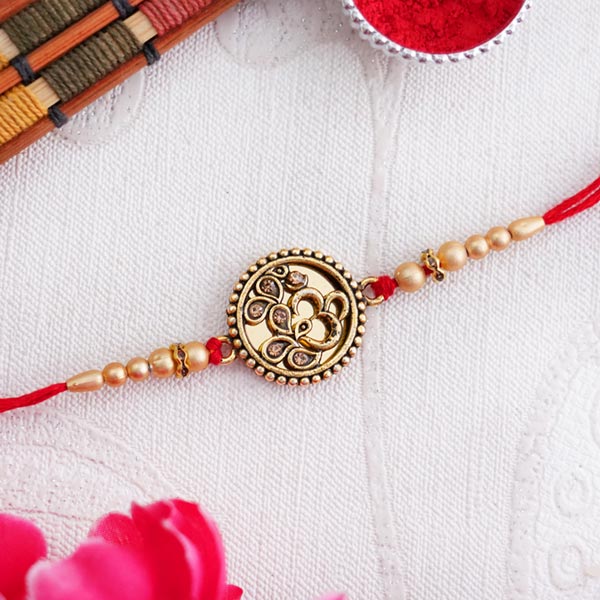 Product Details: • Rakhi Type: OM Rakhi • Set Type: Single Rakhi • Recipient: Brothers • Color: Multicolored • Material Used: Gold-plated metal, beads, and Mauli threads • Brand: Sendrakhi.com • A packet of Roli and Chawal with containers are also included