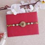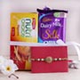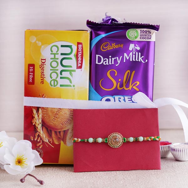 Rakhi •Rakhi Type: Golden Rakhi •Set Type: Set of 1 •Recipient: Brothers •Color: Multicolored •Material Used: Gold-platted metal, beads, and silk threads Chocolates •1 Nutri Choice of 250gm •1 Dairy Milk Oreo of 130gm Other Items: •A packet of Roli and Chawal with containers are also included