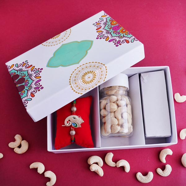 The Signature Box Contains: • One Golden Rakhi • 80 gm Cashews packed in a container • Roli and Chawal in containers with the designer signature box