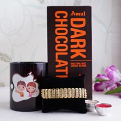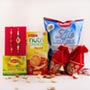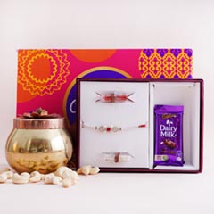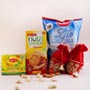 Product Details: • One Golden Rakhi and One Rudraksha Rakhi • One pack of Nutri Choice biscuits • 100gm of Almonds packed in a designer potli • 100gm of Cashews packed in a designer potli • One pack of Lipton Green Tea with ten tea bags • One pack of Haldiram Lite Murmura of 150gm • Roli and chawal with containers are also included.