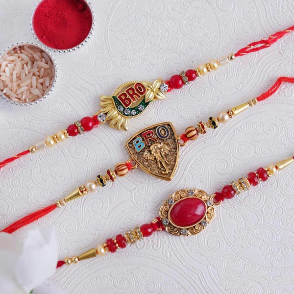 Product Overview: • Rakhi Type: Golden Rakhi • Set Type: Set of 3 Rakhi • Recipient: Brothers • Color: Multicolored • Material Used: Beads, Gold-plated metal, and silk thread • A pack Roli & Chawal and containers are included with Rakhi set