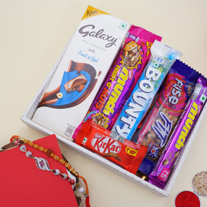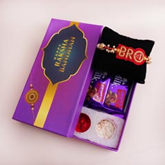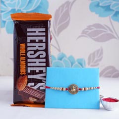 Product Details: •Rakhi Type: Golden Rakhi •Set Type: Set of 1 •Recipient: Brothers •Color: Multicolored •Material Used: Gold-platted metal, stones, beads, and silk threads Chocolates •16 pieces of Ferrero Rocher chocolates