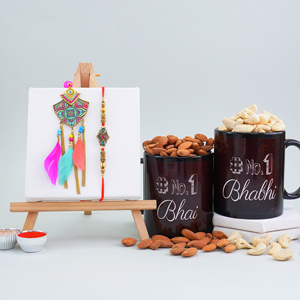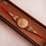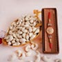 Product Details: • Rakhi Type: Designer Golden Rakhi in a box • Set Type: Single Rakhi • Recipient: Brothers • Color: Multicolored • Material Used: Gold-plated metal, stones, beads, and silk threads • A packet of Roli and Chawal with containers Dry fruits • 100 gm Cashews Other Gifts • One leaf-shaped golden tray with a spoon in a box