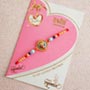 Rakhi • Rakhi Type: Golden Rakhi on a Card • Set Type: Single Rakhi • Recipient: Brothers • Color: Multicolored • Material Used: Gold-plated metal, beads, and silk threads • A packet of Roli and Chawal with containers Sweets • Haldiram Small Mewa Laddoo – 250 gm