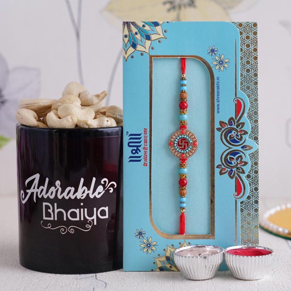 Rakhi Details: •Type of Rakhi: Golden Swastika Rakhi •Rakhi Set: Single •Recipient: Brother •Color: Multicolored •Material Used: Gold-plated metal, colorful beads, and silk thread •Roli and chawal pack along with containers are included with hamper Dry Fruits: •100gm Cashews Other Gift Items: •One black-colored mug with the text “Adorable Bhaiya.”