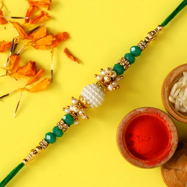 Product Details One Green Pearl & Beads Designer Rakhi, This designer rakhi highlights green pearls & beads for a traditional look, Complimentary Roli Chawal packed in a small card, This Rakhi is packed in a beautiful Sneh envelope