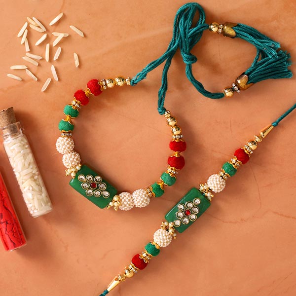 Product Details One Bhaiya Bhabhi Lumba Rakhi Set, Intricately designed Rakhi with Green Pearls, One of the most loved designs for Raksha Bandhan, Complimentary Roli Chawal packed in a small card, This Rakhi Set is packed in a beautiful Sneh env