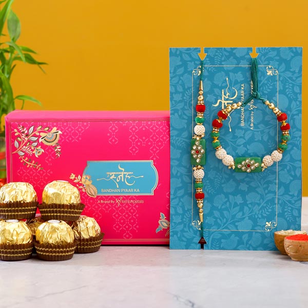 Product Details: One Bhaiya Bhabhi Lumba Rakhi Set, Intricately designed Rakhi with Green Pearls, One of the most loved designs for Raksha Bandhan, Almonds- 250 gms, Complimentary Roli Chawal packed in a small card, Beautifully packed in Sneh Box