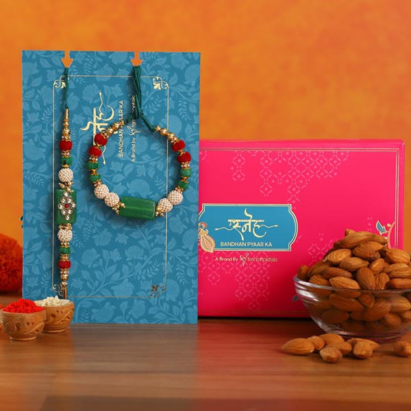 Product Details One Bhaiya Bhabhi Lumba Rakhi Set, Intricately designed Rakhi with Green Pearls, One of the most loved designs for Raksha Bandhan, Almonds- 250 gms, Complimentary Roli Chawal packed in a small card, Beautifully packed in Sneh Box
