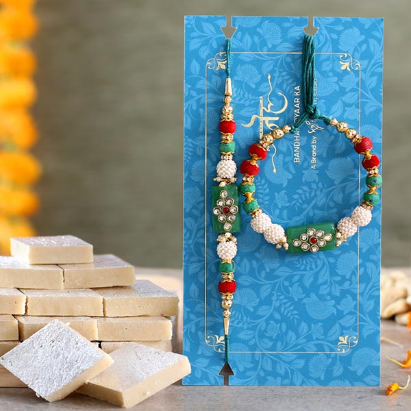 Product Details One Bhaiya Bhabhi Lumba Rakhi Set, Intricately designed Rakhi with Green Pearls, One of the most loved designs for Raksha Bandhan, Haldiram Kaju Katli, Weight- 250 gms, Complimentary Roli Chawal packed in a small card, Beautifull