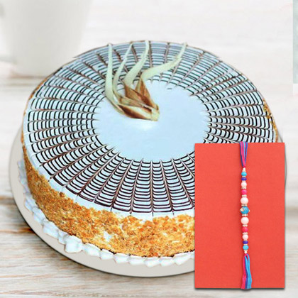 Product Overview • Rakhi: Single beaded Rakhi • Flavor of Cake: Butterscotch • Weight: 500 gms • Knife is complementary • A packet of roli and rice-free The yummiest cake and beautiful Rakhi will surely turn the special day of Raksha Bandhan into the most happening one for your darling brother. Now what you have to do is just place the order of this amazing combo from us. So, hurry up and enjoy the festival wholeheartedly.