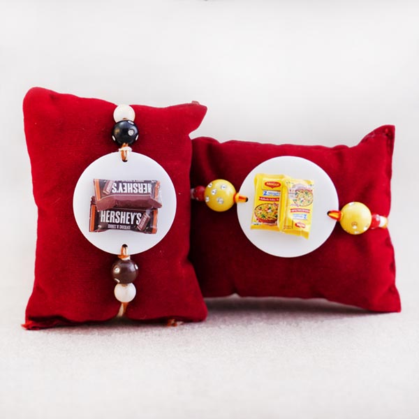 Product Details: • Rakhi Type: One Hershey''s Foodie Rakhi and One Maggie Foodie Rakhi • Set Type: Set of Two • Recipient: Brothers • Color: Multicolored • Material Used: Plastic, fiber, silicone, beads, and stylish silk thread • Brand: Sendrakhi.com • Roli & Chawal with containers are included with this Rakhi set