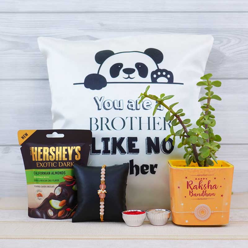 Jade Plant with Pearl Rakhi N Cushion Combo