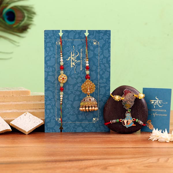 Product Details One Bhaiya Bhabhi Lumba Rakhi Set, This jhumki style rakhi set showcases dancing peacock, One Bal Krishna Rakhi, One Bal Ganesha Kids Rakhi, , Kaju Katli- 250 gms,