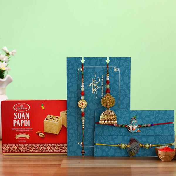 Product Details One Bhaiya Bhabhi Lumba Rakhi Set, This jhumki style rakhi set showcases dancing peacock, One Bal Krishna Rakhi, One Bal Ganesha Kids Rakhi, , Soan Papdi- 250 gms,