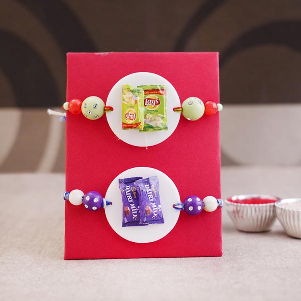 Product Details: • Rakhi Type: One Lays Foodie Rakhi and One Dairy Milk Foodie Rakhi • Set Type: Set of Two • Recipient: Brothers • Color: Multicolored • Material Used: Plastic, fiber, silicone, beads, and stylish silk thread • Brand: Sendrakhi.com • Roli & Chawal with containers are included with this Rakhi set