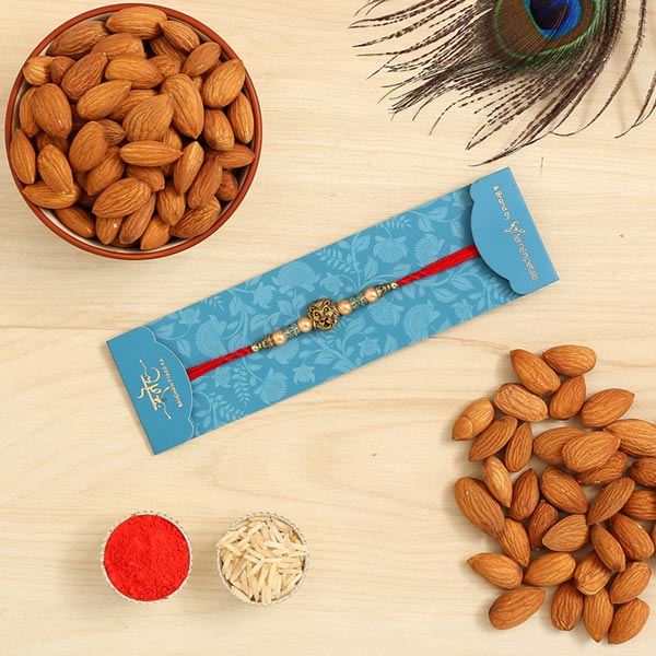 Product Details One Lion Face Rakhi, This designer rakhi displays lion face pearl & stone detailing, Almonds- 250 gms, Complimentary Roli Chawal packed in a small card, Beautifully packed in Sneh Box,