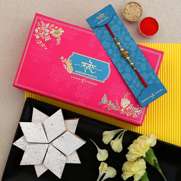 Product Details , One Lion Face Rakhi, This designer rakhi displays lion face pearl & stone detailing, Haldiram Kaju Katli, Weight- 250 gms, Complimentary Roli Chawal packed in a small card, Beautifully packed in Sneh Box,