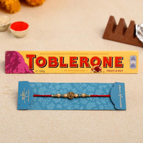 Product Details One Lion Face Rakhi, This designer rakhi displays lion face pearl & stone detailing, Toblerone Chocolate Milk Bar, Weight- 100 gms, Complimentary Roli Chawal packed in a small card, Beautifully packed in Sneh Box