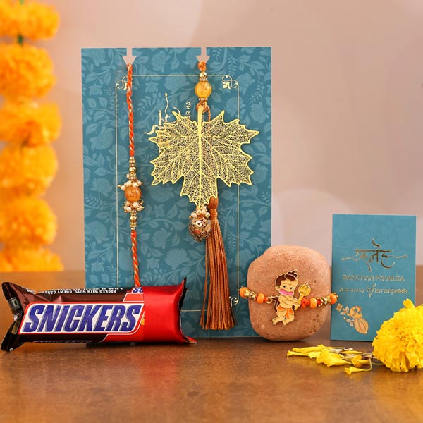 Product Details One Bhaiya Bhabhi Lumba Rakhi Set, This modern design rakhi set displays maple leaf detailing, One Bal Hanuman Kids Rakhi, This Rakhi is categorically designed for kids who are fond of devotional cartoon characters, One Snickers Chocolate Bar,