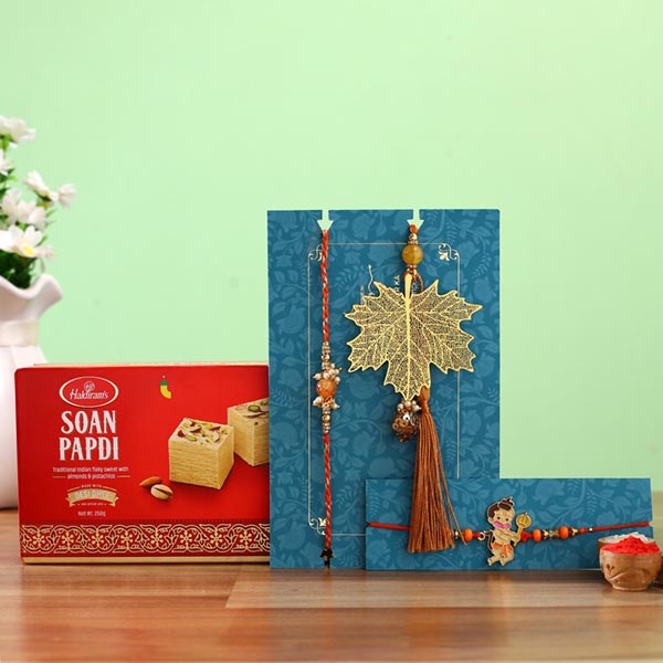 Product Details One Bhaiya Bhabhi Lumba Rakhi Set, This modern design rakhi set displays maple leaf detailing, One Bal Hanuman Kids Rakhi, , Soan Papdi- 250 gms, Complimentary Roli Chawal packed in a small card,