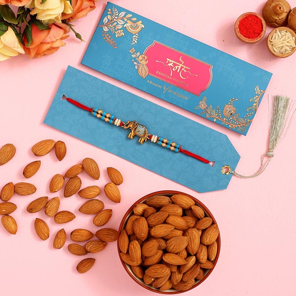Product Details One Meenakari Elephant Shaped Rakhi, This ethnic rakhi showcases an elephant & meenakari work for a traditional look, Almonds- 250 gms, Complimentary Roli Chawal packed in a small card, Beautifully packed in Sneh Box,