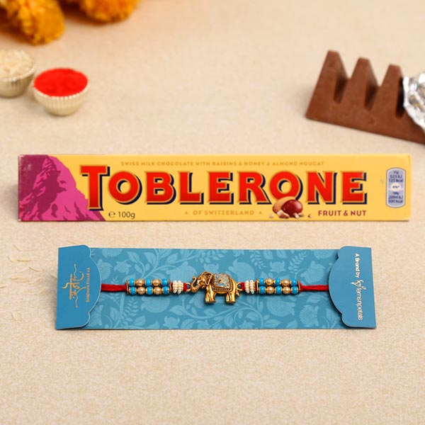Product Details One Meenakari Elephant Shaped Rakhi, This ethnic rakhi showcases an elephant & meenakari work for a traditional look, Toblerone Chocolate Milk Bar, Weight- 100 gms, Complimentary Roli Chawal packed in a small card, Beautifully packed in Sneh Box