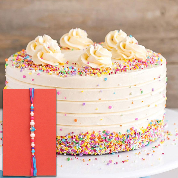 Product Overview • Rakhi: Single beaded Rakhi • Flavor of Cake: Vanilla • Weight: 500 gms • Knife is complementary • A packet of roli and rice is included with the combo Raksha Bandhan is about to knock the door, so what’s your plan to make it unforgettable to sweet brother. If you yet have not decided anything, then go for this thoughtful Rakhi combo. It contains eye-catchy Rakhi and delectable cake which would surely make the occasion very special for your brother. So, don’t waste the time and just place the order of this combo from us and enjoy the festival.