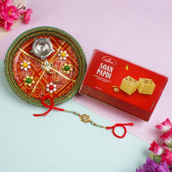 Metal Diamond Rakhi with Puja Thali & Sweet Hamper For UK