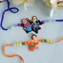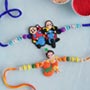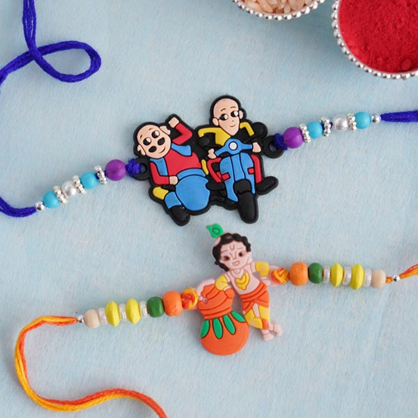 Product Overview: • Rakhi Type: Motu Patlu Rakhi and Chhota Bheem Rakhi for Kids • Set Type: Set of 2 Rakhi • Recipient: Brothers • Color: Multicolored • Material Used: Soft Fabric, pearls, plastic, beads, and stylish silk thread • A pack of Roli & Chawal is free along with containers