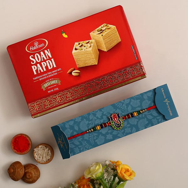 Product Details One Multicoloured Lord Ganesha Rakhi, This devotional rakhi showcases Lord Ganesha for an auspicious look, Haldiram''s Soan Papdi, Weight- 250 gms, Complimentary Roli Chawal packed in a small card, Beautifully packed in Sneh Box