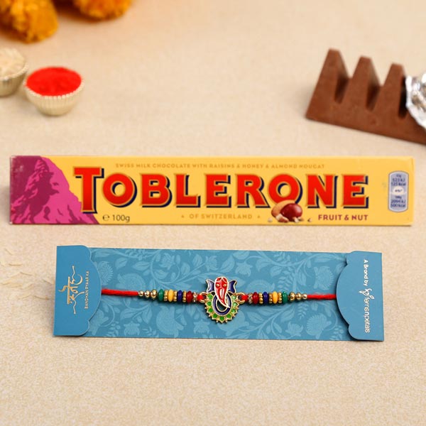 Product Details One Multicoloured Lord Ganesha Rakhi, This devotional rakhi showcases Lord Ganesha for an auspicious look, Toblerone Chocolate Milk Bar, Weight- 100 gms, Complimentary Roli Chawal packed in a small card, Beautifully packed in Sneh Box