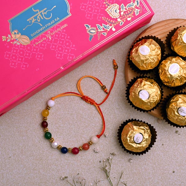 Product Details One Navrattan Bracelet Style Rakhi, This designer rakhi displays navrattan pearls for a striking look, Ferrero Rocher, Quantity- 3 Pcs, Complimentary Roli Chawal packed in a small card, Beautifully packed in Sneh Box