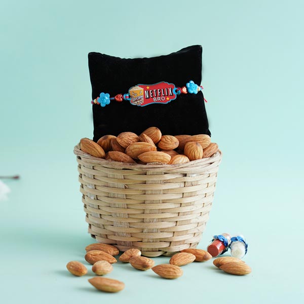Product Details: • Rakhi Type: Netflix Rakhi • Set Type: Single Rakhi • Recipient: Brothers • Color: Multicolored • Material Used: Fabric, beads, and silk threads • A packet of Roli and Chawal with containers Dry fruits • 100 gm Almonds Other Gifts • A wooden basket